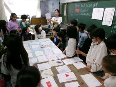 線の書き方や組み合わせを考え、自由に画用紙にあらわし、全員が書き終わった後、前の机に並べて皆で見合いました。