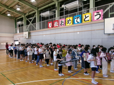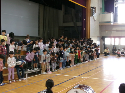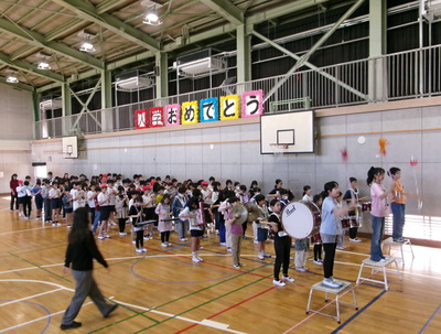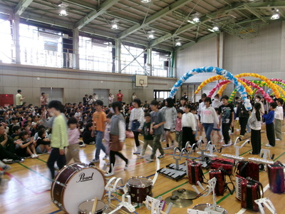 6年生が退場時「ミッキーマウスマーチ」を演奏し、1年生は迫力に圧倒されていました。