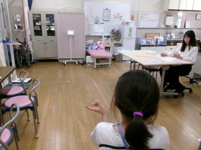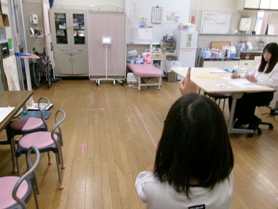 2年生が保健室で、視力検査をしていました。右目、左目と順番に、Cが切れているところが見えるかな?