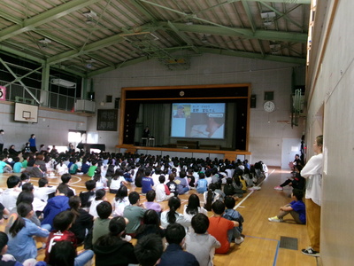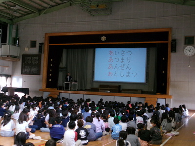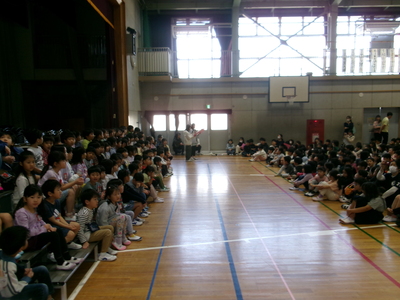 今年度から、月に1回は体育館で全校朝会を行うことにしました。
