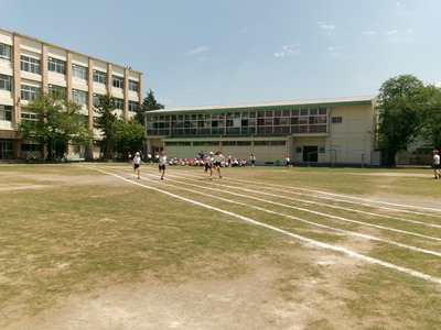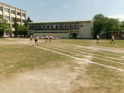 体育では、5年生が50m走のタイム計測をしていました。